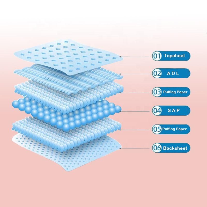 a fibra fluff misturada com polímeros altamente absorventes atrai e condensa toda a umidade instantaneamente e suficientemente, evitando o refluxo e o vazamento.