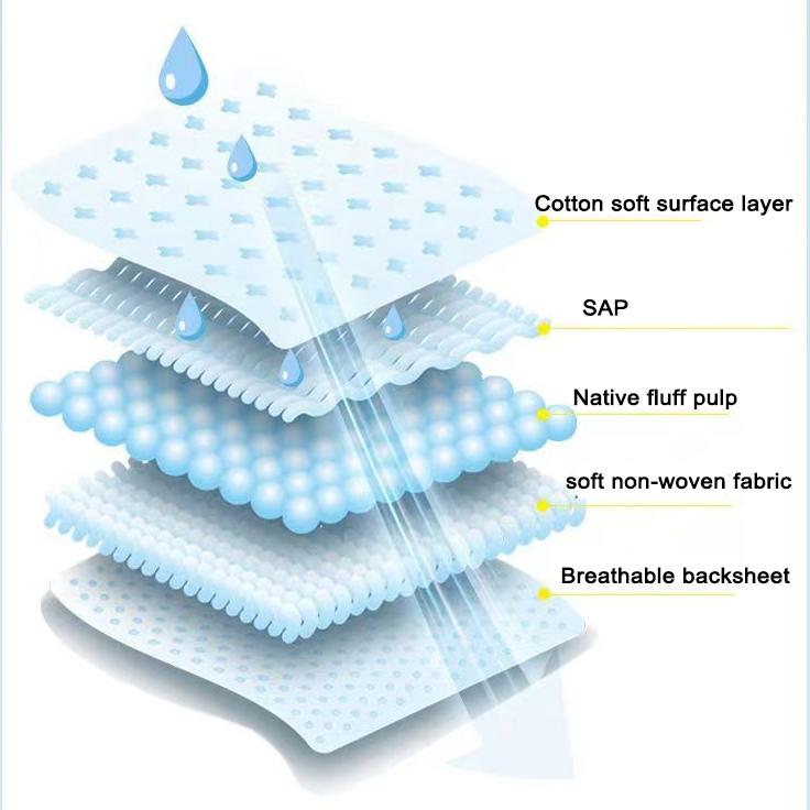 Núcleo de algodão: Polpa fluff dos EUA + SAP + tecido com relevo rômbico garante absorção rápida e alta.